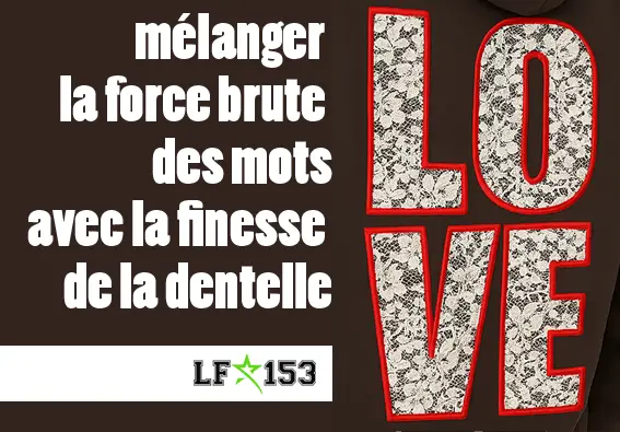 Depuis le début de LF-153, je m’amuse à croiser des univers qui, à première vue, n’ont rien à voir. Avec cette ligne de sweats, j’ai voulu mettre en avant une idée qui me fascine : Mélanger la force brute des mots avec la finesse de la dentelle. Des mots forts, des messages clairs Le point […]