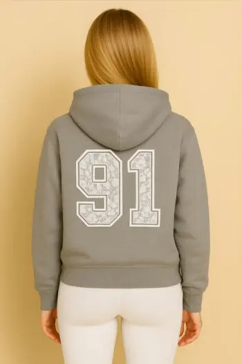 Sweat oversize Gris LF153, brodé en France : chiffre 91 en dentelle blanche et contour en broderie artisanale épaisse, une pièce premium et identitaire en série limitée.