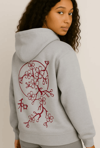 Jogging SAKURA (sweat capuche + pantalon) – Design LF153 exclusif. Impression DTF couleurs résistantes, disponible en gris et beige, du S au 2XL. Style premium, confortable et durable.