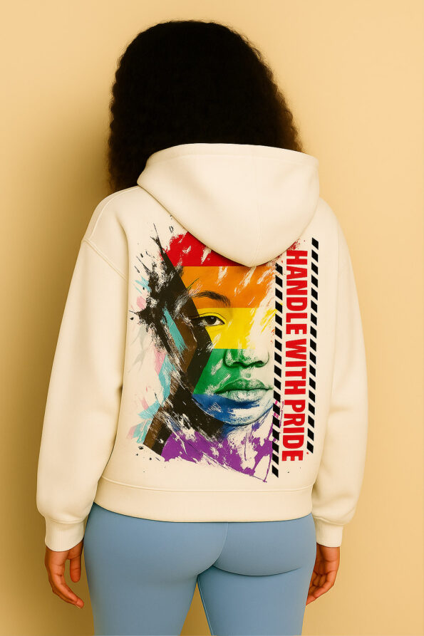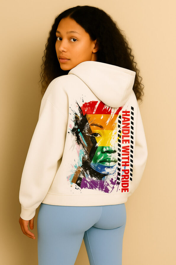 À l’arrière, l’imposant visuel détourne les codes de la signalétique pour les associer aux couleurs du drapeau de la fierté inclusive. Le portrait graphique, enrichi d’éclaboussures et de coups de pinceaux, met en avant le slogan percutant HANDLE WITH PRIDE (Manipuler avec fierté). Une composition artistique forte et engagée, directement inspirée de l’esprit streetwear et des tendances urbaines.