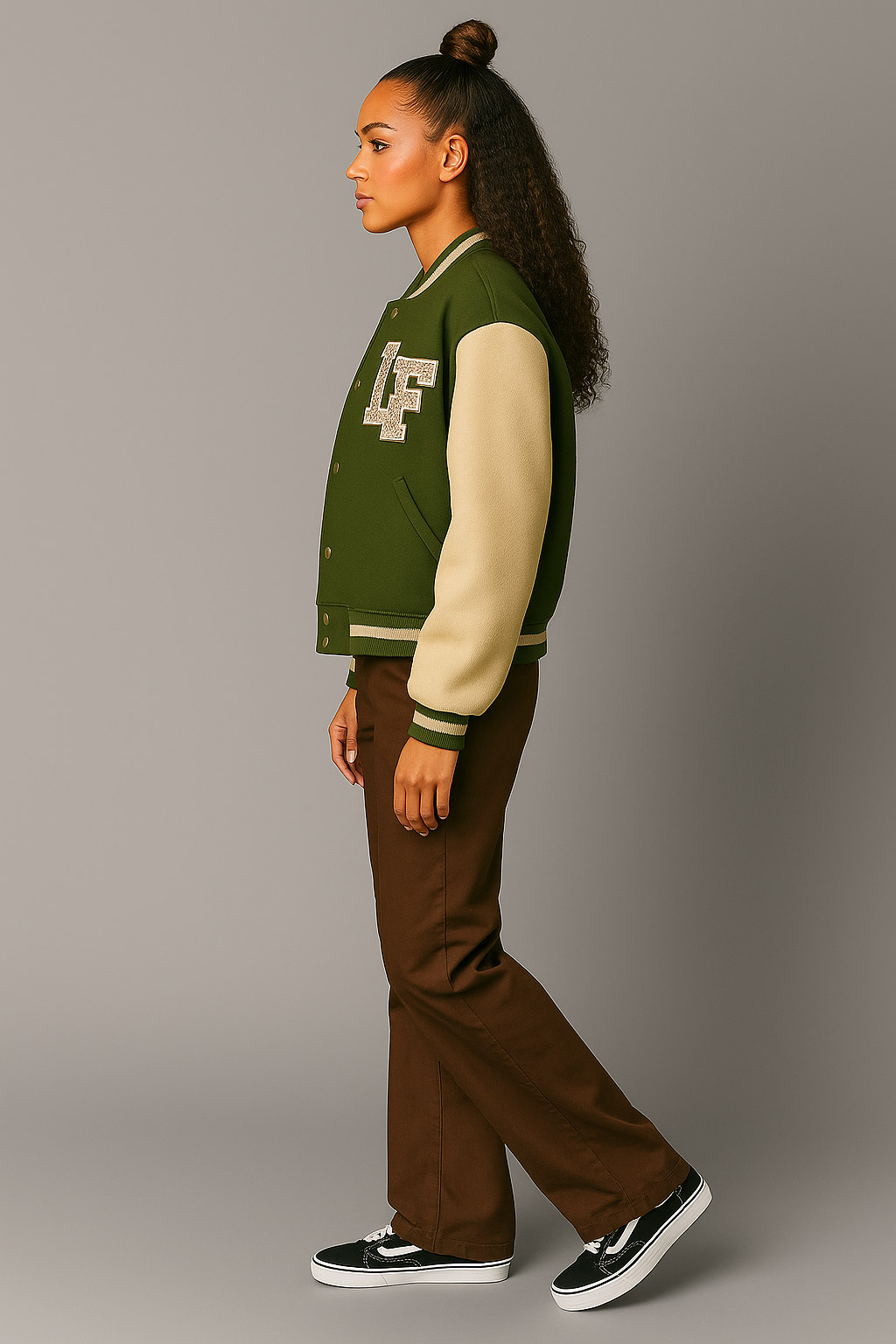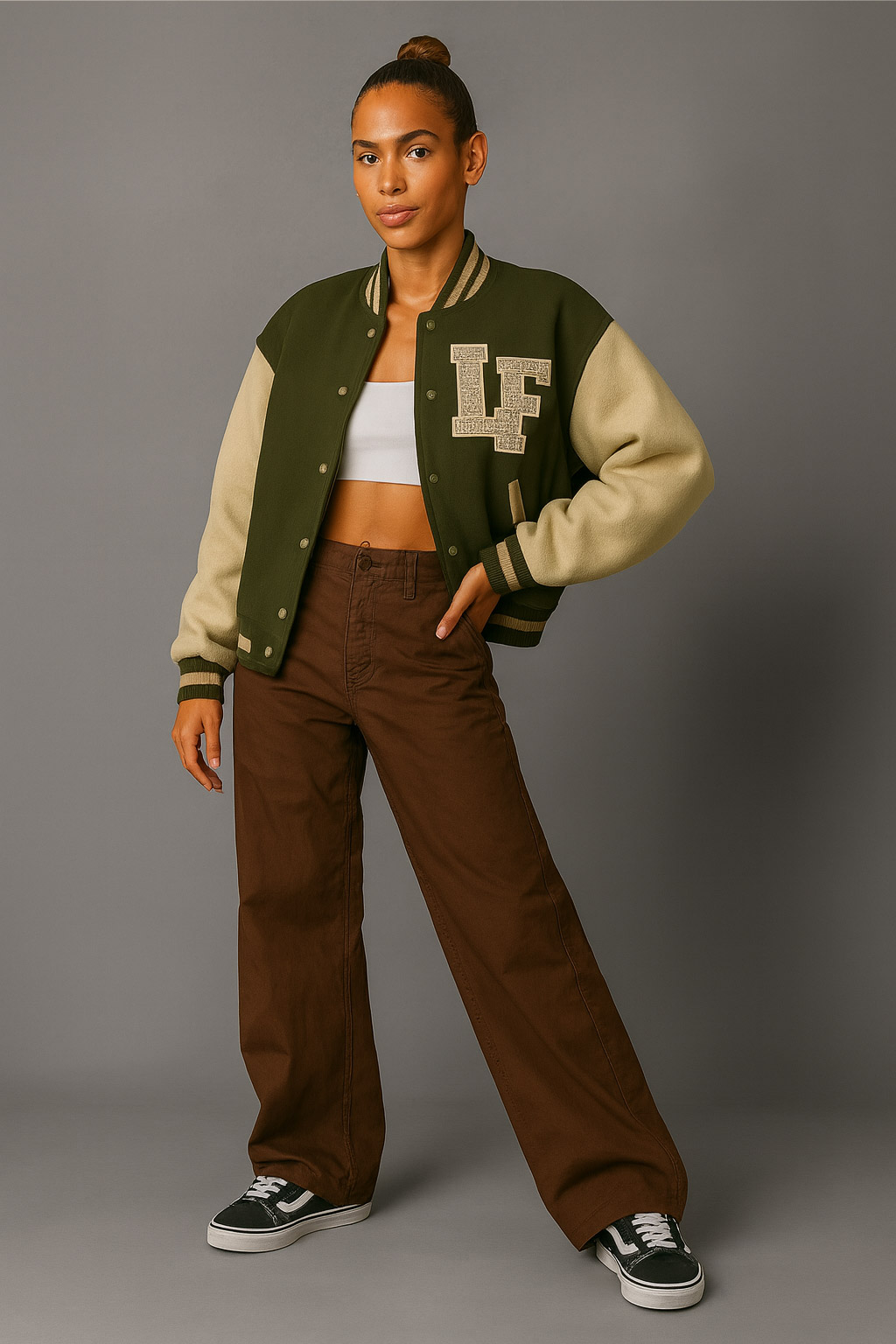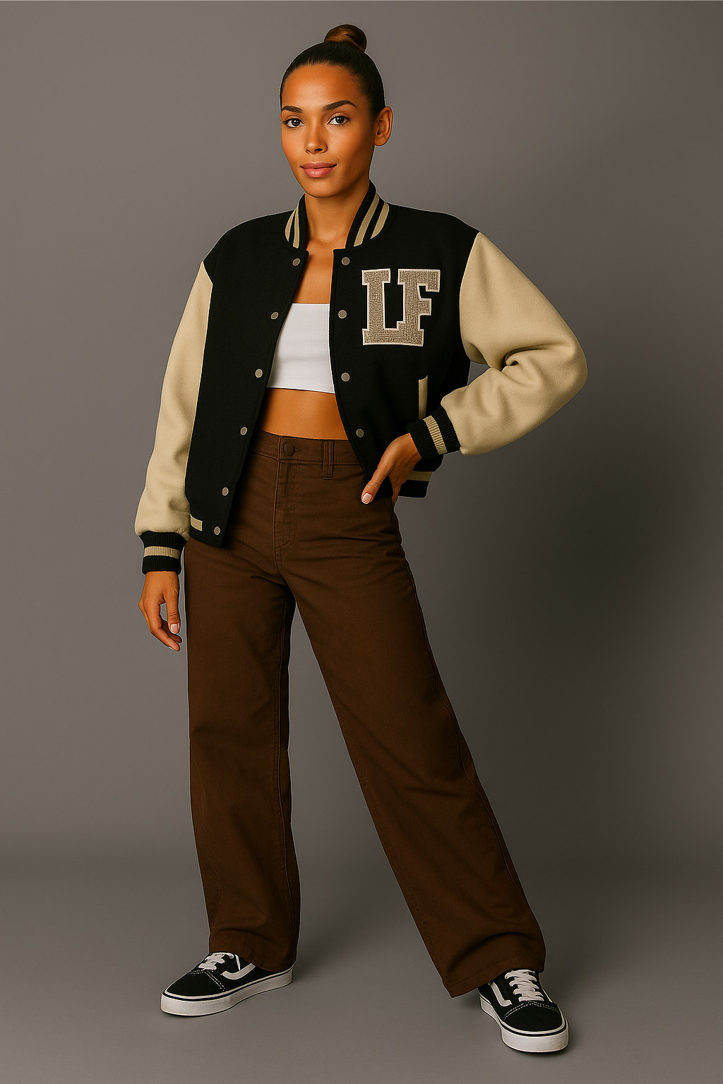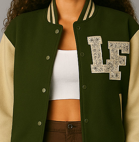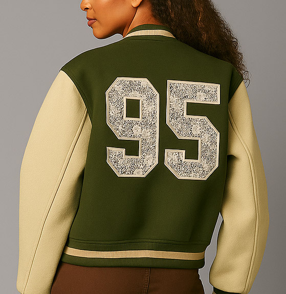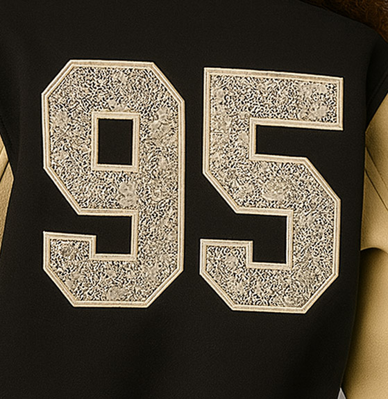 Ce blouson Varsity bi-colore arbore un design exclusif autour du chiffre 95, revisité avec une broderie dentelle guipure élégante, mise en valeur par un contour beige contrasté.
