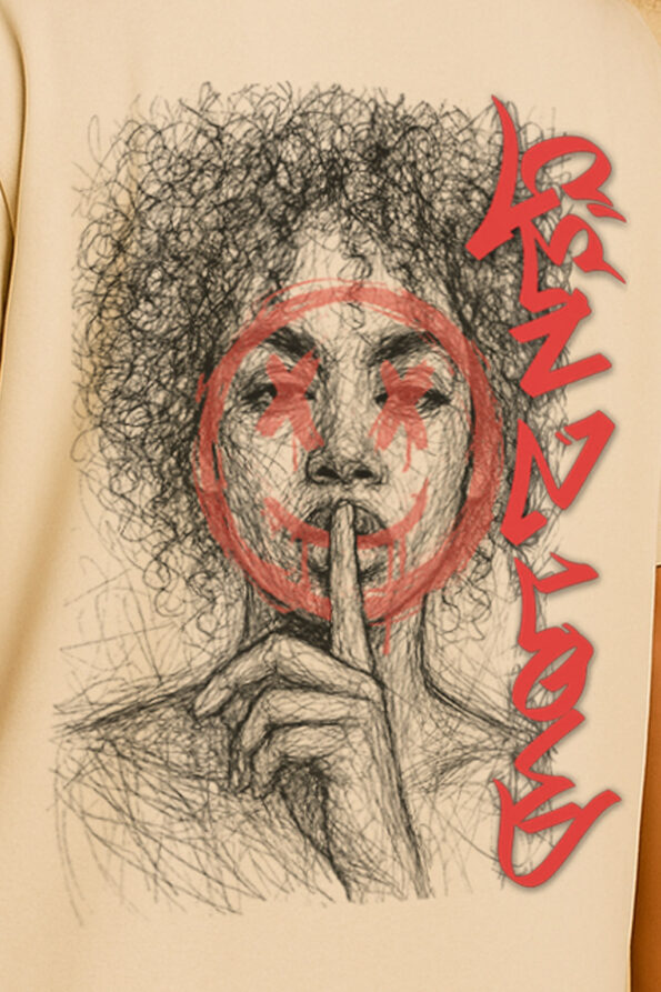 Le visuel, réalisé en traits nerveux et organiques, dévoile un visage puissant, le doigt posé sur les lèvres comme pour imposer un secret… mais immédiatement brisé par un smiley rouge déformé aux yeux barrés et au sourire peint. Le contraste entre le geste du silence et l’éclat du graffiti raconte toute la tension de la Gen Z : entre mutisme forcé et expression éclatante.