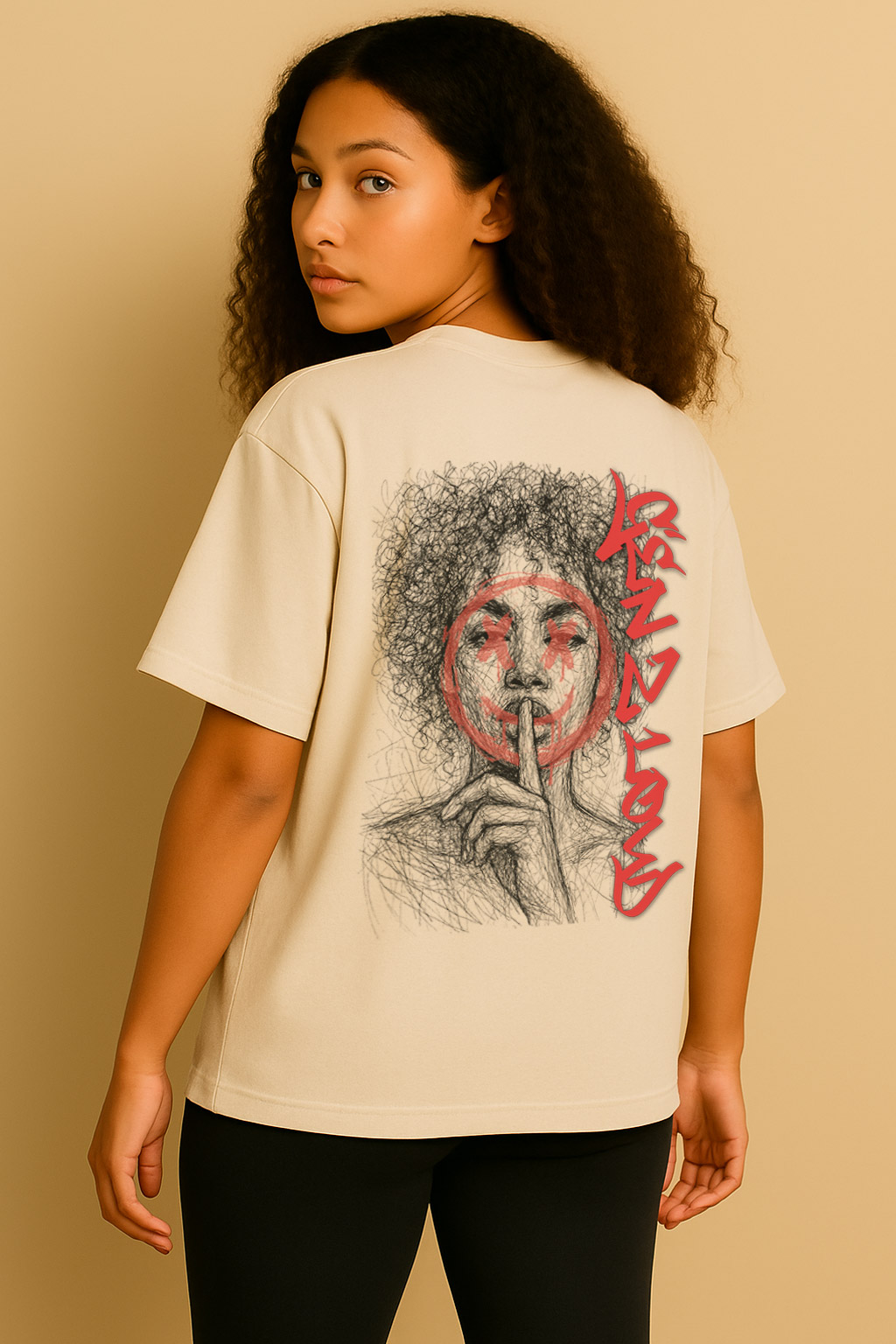 Un portrait graphique puissant, barré d’un smiley rouge explosif, contraste avec le geste du silence. Sur le côté, le lettrage graffiti “Gen Z Loud” affirme toute l’énergie d’une génération qui refuse de se taire.